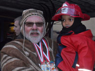 SPD-Stadtrat Horst Noack und Nachwuchs-Karnevalist Benjamin freuen sich mit dem Präsidenten der KG-Uhu, Rainer Ott, über den Besuch des Kölner Dreigestirns bei der Straßensitzung am Karnevalssamstag.