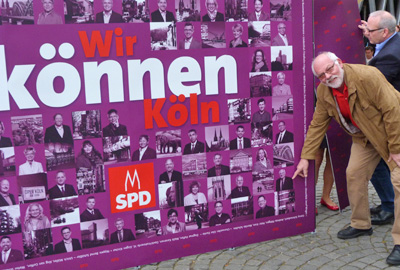 Auf einem Großflächenplakat bekennen sich alle Kandidaten und Kandidatinnen zum Wahlkampf-Slogan der KölnSPD: „Wir können Köln!“ – „und ich kann Dellbrück! ergänzt schmunzelnd der Dellbrücker SPD-Stadtrat und Ratskandidat Horst Noack. Gemeinsam mit Oberbürgermeister Jürgen Roters posierten die Ratskandidaten der Stadtteile aus dem Stadtbezirk Mülheim zum Foto.